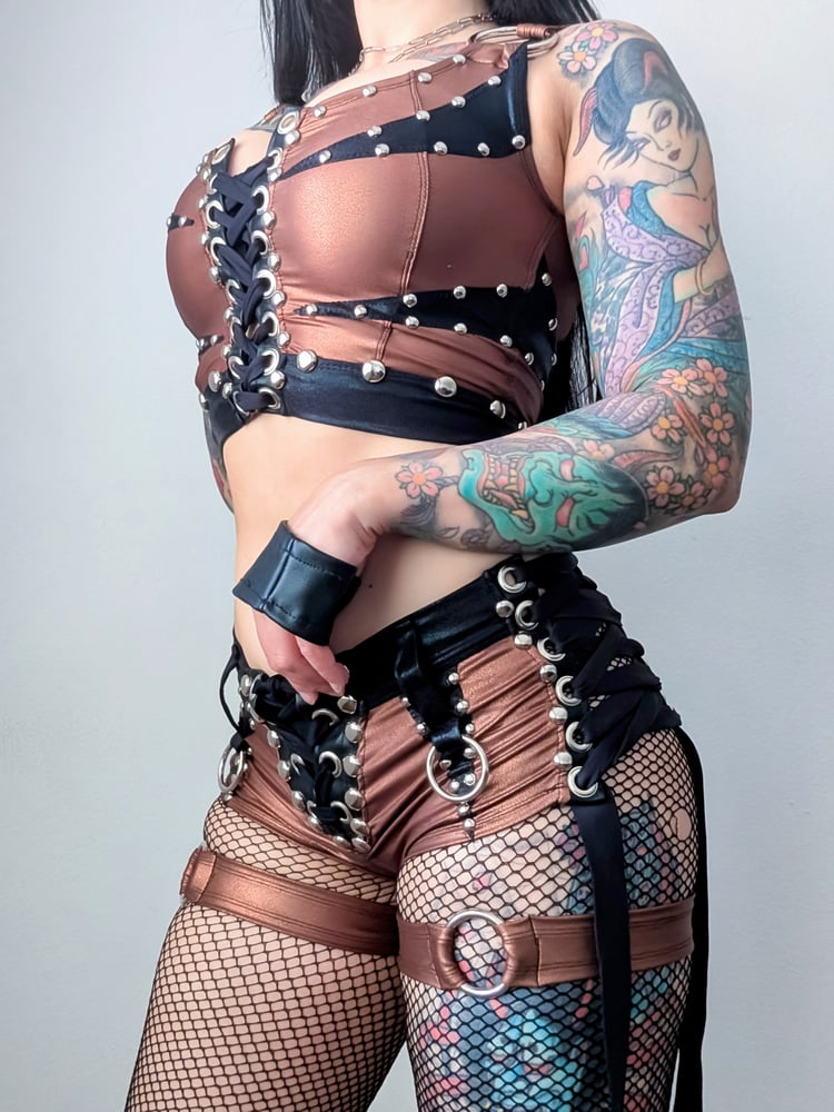 Made from - Metallic bronze spandex, black wetlook spandex, faux leather